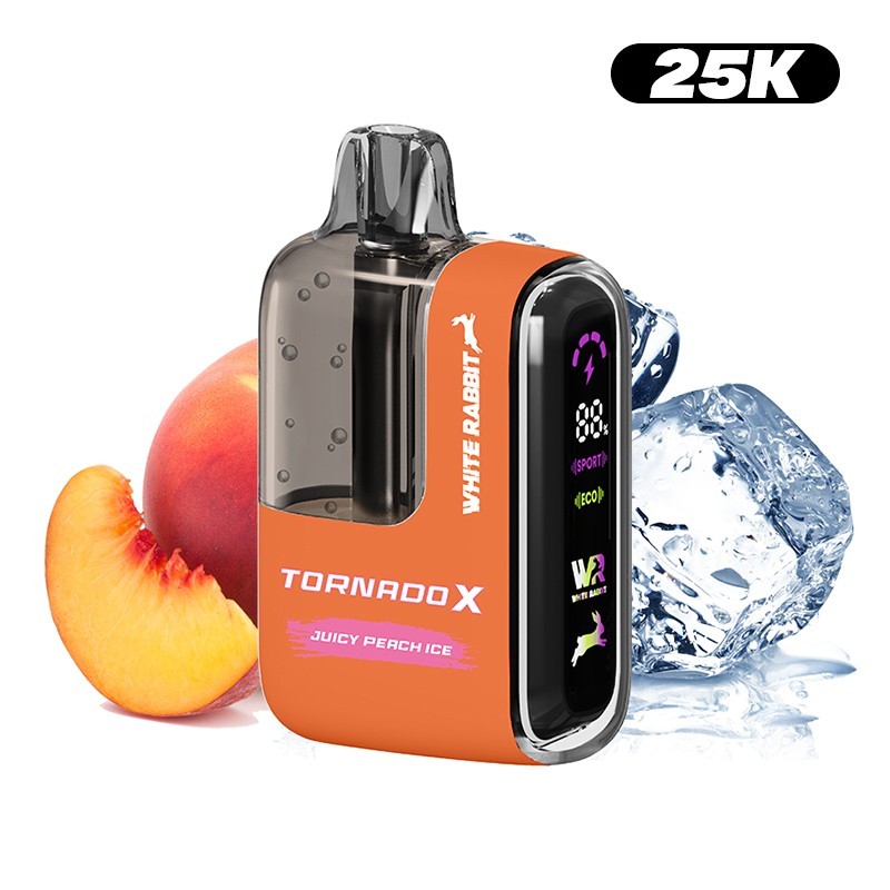 Hier ist der Puff 25K Juicy Peach Ice Tornado mit 2 % Nikotin. Er bietet Ihnen außergewöhnliche Aromen von saftigem und süßem Pfirsich sowie ein angenehm intensives Frischegefühl.